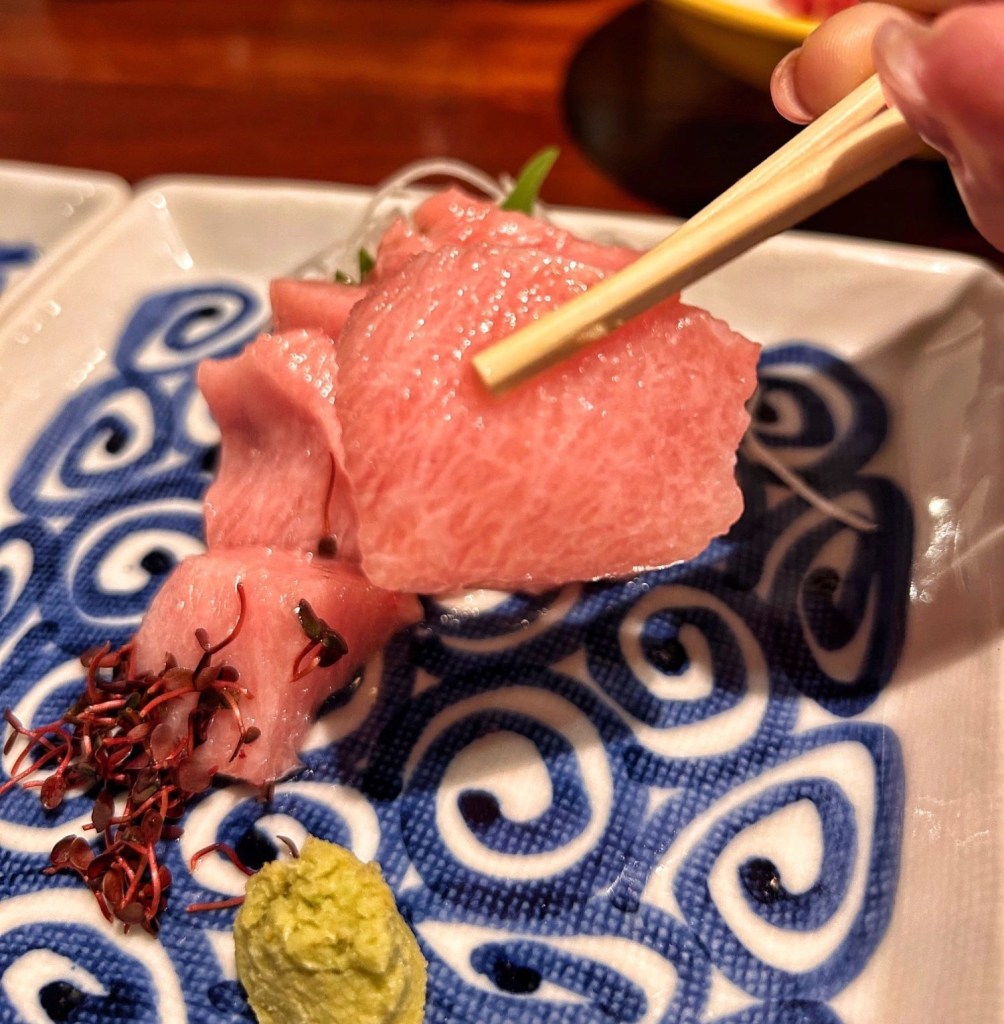 A seguito dello spettacolo abbiamo assaggiato il Kamatoro. Erroneamente si pensa che il tonno più pregiato sia il Chutoro o l’Otoro. In realtà tra le vere parti rare e pregiate del tonno c’è il Kamatoro cioè la guancia posteriore del tonno. Questa parte è più grassa e succosa, molto rara da trovate nei ristoranti e molto più costosa, questo perché da un tonno ne escono pochissime porzioni.