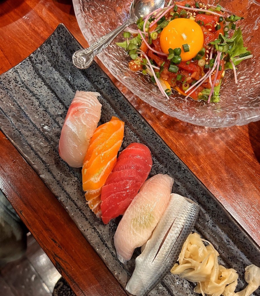 Chutoro (parte mediamente grassa del tonno), tamago (frittata aromatizzata), negitoro hosomaki (tonno ed erba cipollina), anguilla, salmone (davvero ottimo), otoro (quello venato, ossia la parte più grassa del tonno, da urlo!), gambero crudo grande. Per un totale di 34€