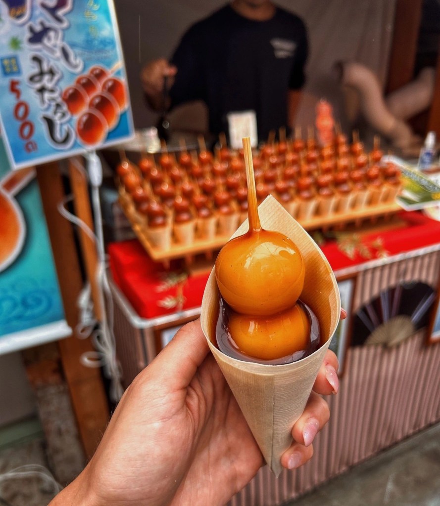 In giro per la città è possibile anche trovare dolcetti tipici come il Mitarashi dango, uno spiedino fatto di piccole polpette di riso glutinoso, condite con farina di soia tostata mescolata con zucchero o con dell’anko, la marmellata di fagioli rossi azuki.