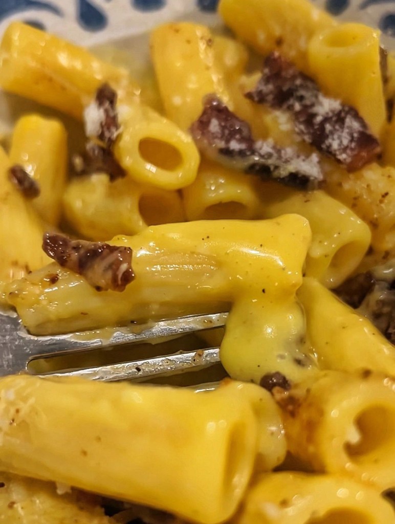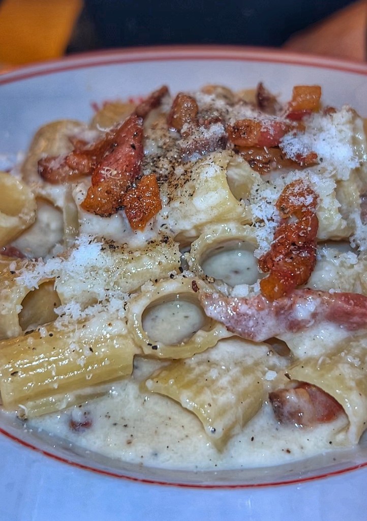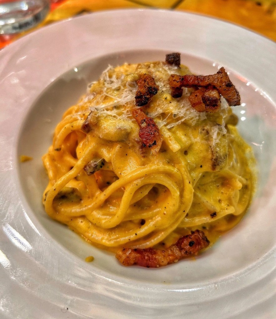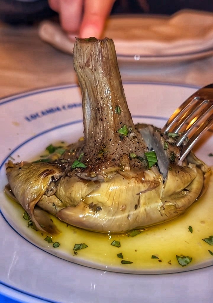 Il menu offre una vasta selezione di piatti, ma sono la carbonara e il carciofo i veri protagonisti. La carbonara qui è molto buona, il guanciale croccante e la crema di uova si fondono in un perfetto equilibrio.